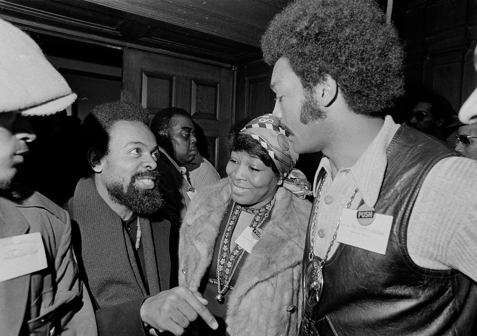 Imamu Amiri Baraka, aka LeRoi Jones, Chairman of the Congress of African People, speaks to Rev. Jesse Jackson, right, and Betty Shabazz, center, widow of Malcolm X, at the Operation PUSH Soul Picnic at the 142nd Street Armory in New York, March 26, 1972. PUSH stands for People United to Save Humanity. (AP Photo/Jim Wells)