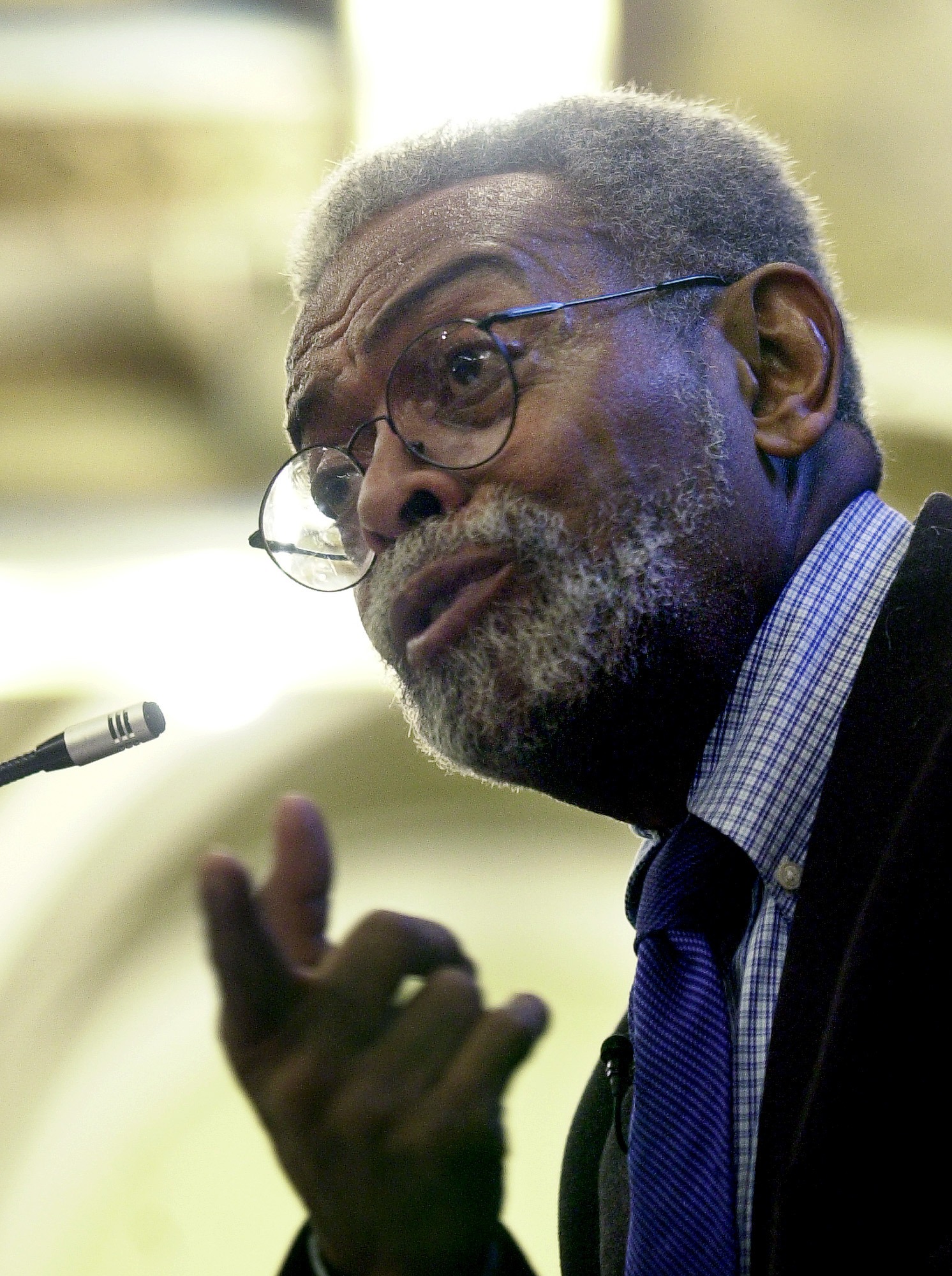 This Oct. 2, 2002 file photo shows Amiri Baraka, New Jersey's poet laureate during a ceremony at the Newark Public Library in Newark, N.J. Baraka, a Beat poet, black nationalist and Marxist revolutionary known for his blues-based, fist-shaking manifestos, died, Thursday, Jan. 9, 2014, at Newark Beth Israel Medical Center in Newark, N.J. at age 79. (AP Photo/Mike Derer, File)