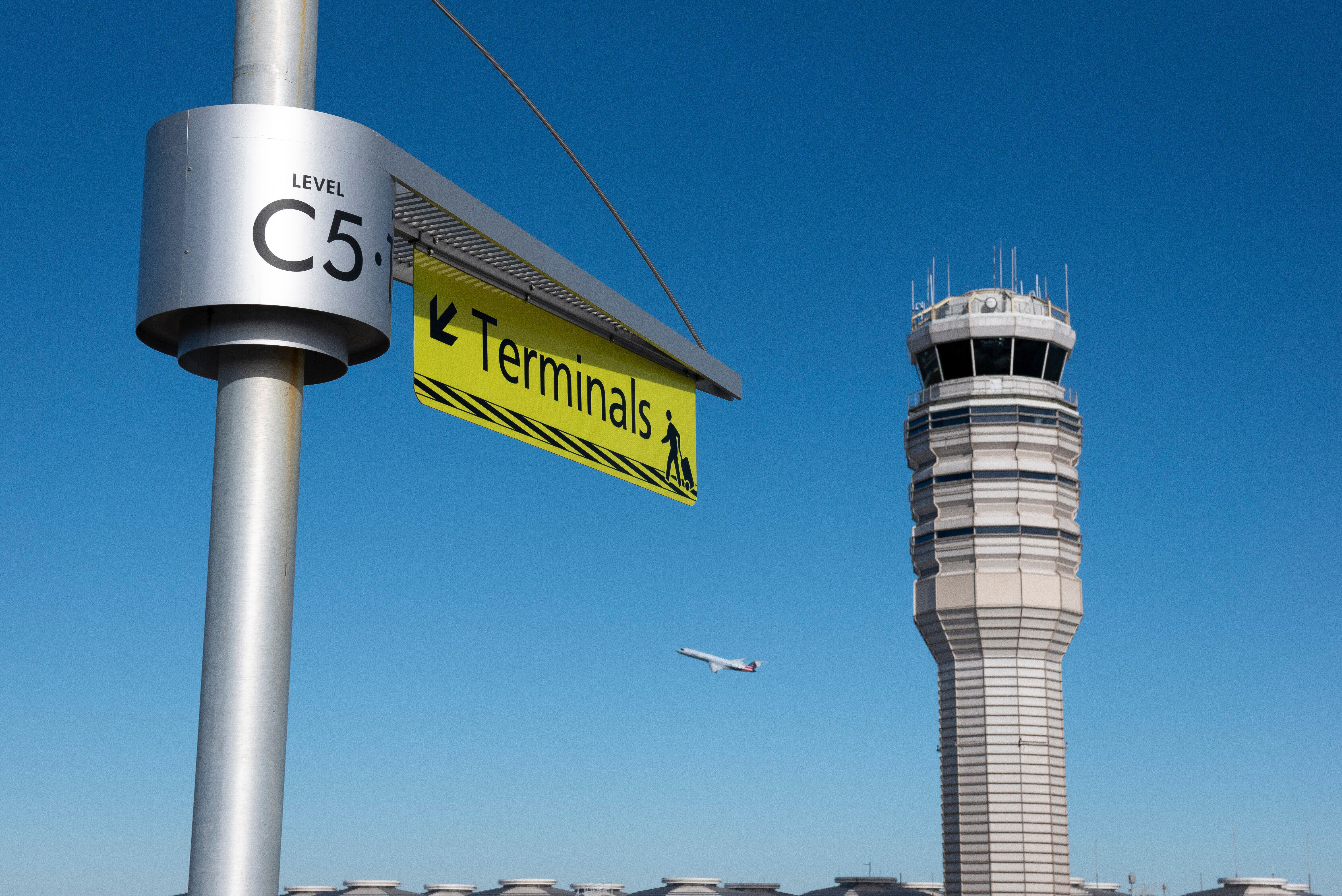 An airplane takes off behind the FAA control tower at Reagan National Airport in Washington, Tuesday, Nov. 4, 2025. (AP Photo/Cliff Owen)
