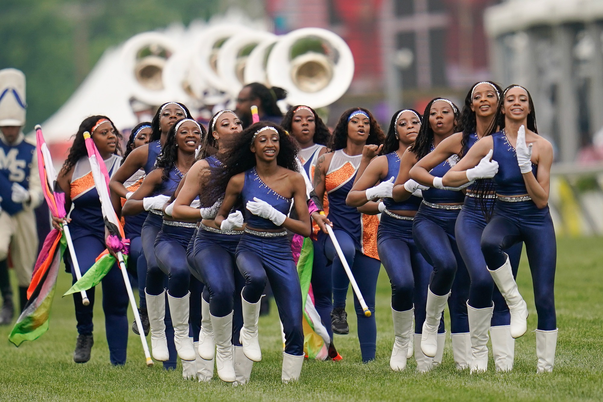Members of the Morgan State University band perform during the 98th running of the Black-Eyed Susan at Pimlico Race Course, Friday, May 20, 2022, in Baltimore. (AP Photo/Julio Cortez)