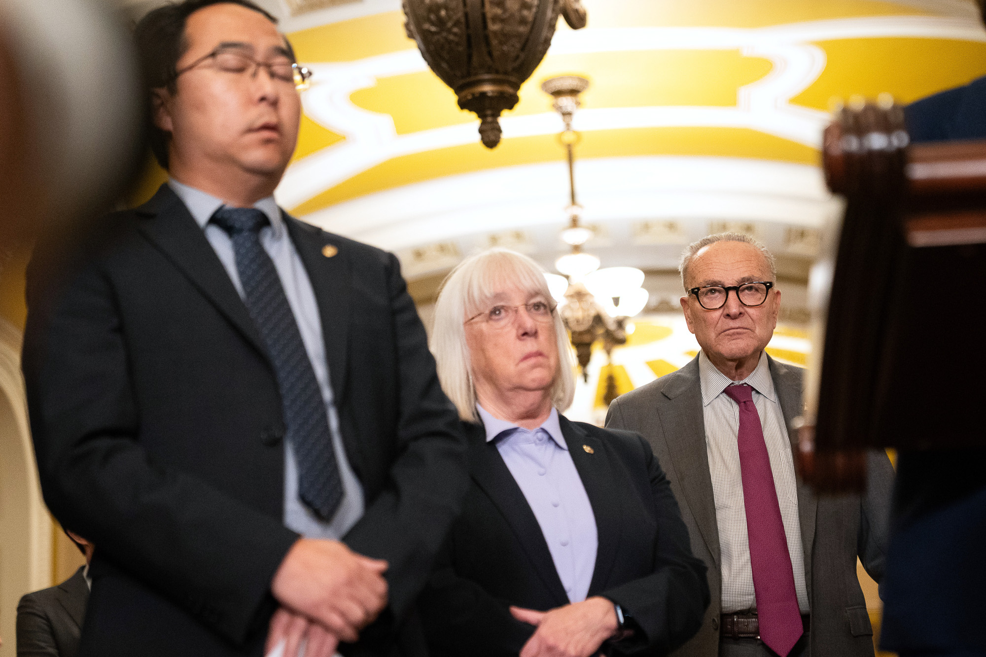 Sen. Andy Kim, D-N.J., Sen. Patty Murray, D-Wash., and Senate Minority Leader Chuck Schumer, D-N.Y., listen during a news conference following the weekly Senate policy luncheon on Capitol Hill in Washington, Tuesday, Oct. 7, 2025. (AP Photo/Allison Robbert)